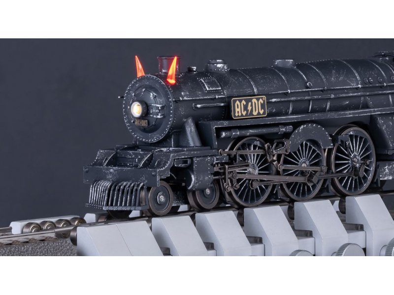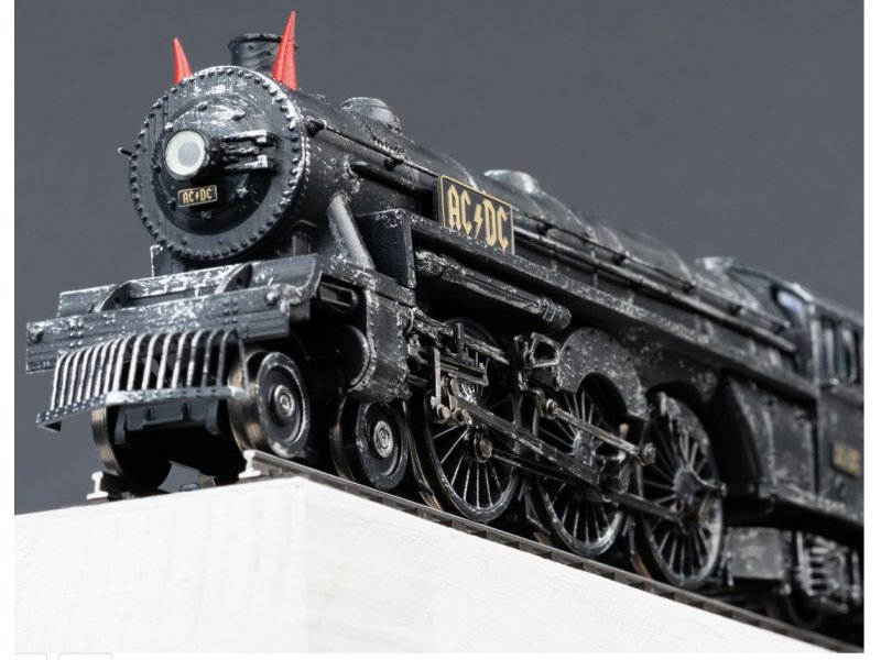 Modell: Mit Digital-Decoder und umfangreichen Licht- und Soundfunktionen. Geregelter Hochleistungsantrieb mit Schwungmasse im Kessel. Drei Achsen angetrieben. Haftreifen. Lokomotive und Tender weitgehend aus Metall. Serienmäßig eingebauter Raucheinsatz, mit geschwindigkeitsabhängigem, dynamischem Rauchausstoß, digital schaltbar. Frontscheinwerfer mittig auf der Rauchkammertür der Lok und eine Lampe an der Tenderrückseite konventionell in Betrieb, digital schaltbar. Die Beleuchtung des Frontscheinwerfers kann auf rot umgeschaltet werden. Die AC/DC typischen Teufelshörner sind beleuchtet und können digital zugeschaltet werden. Führerstandsbeleuchtung und Feuerbüchsenflackern digital schaltbar. Beleuchtung des Tender-Durchgangs digital schaltbar. Beleuchtung mit wartungsfreien warmweißen und roten Leuchtdioden (LED). Verstellbare Kurzkupplung mit Kinematik zwischen Lok und Tender. Am Tender kinematikgeführte Kurzkupplung mit NEM-Schacht. Pufferhöhe an Lok und Tender nach NEM. Bremsschläuche, Schraubenkupplungsimitationen und geschlossene Zylinderdeckel liegen bei. Länge über Puffer ca. 24,5 cm.