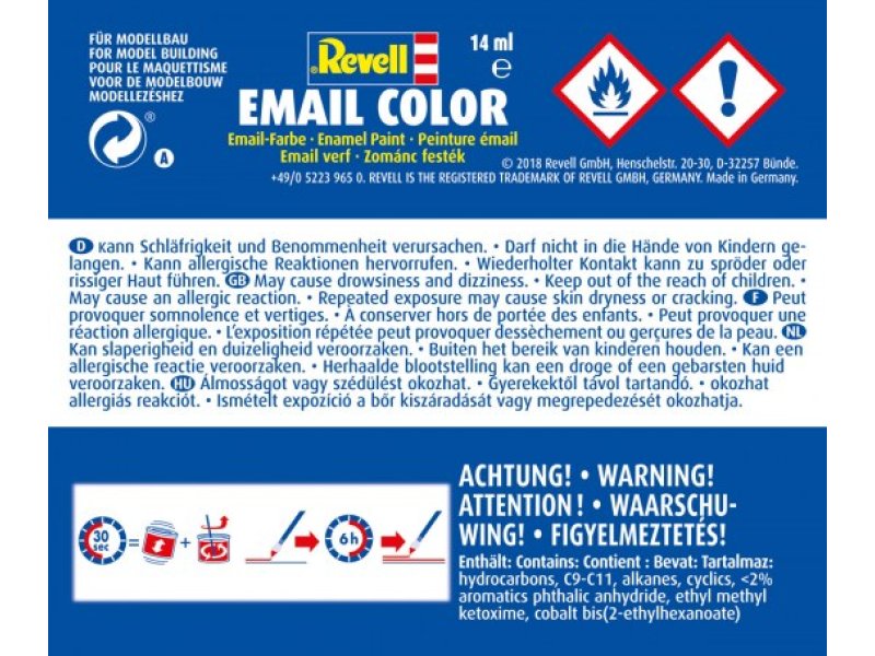 Revell Color ist ein Kunstharz-Emaillelack, der die Kunststoffoberfläche von Plastikmodellen nicht angreift. Aus der bei vielen Bastlern beliebten 14-ml-Lackdose können aber auch viele andere Materialien bemalt werden. Alle Farbtöne - außer Signalfarbe - sind untereinander mischbar und können mit Revell Color Mix verdünnt werden. So kann der Lack nicht nur mit dem Pinsel, sondern auch mit einer Spritzpistole aufgebracht werden.
