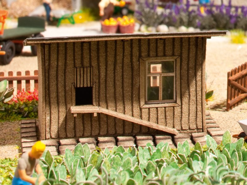 Der Laser-Cut minis Bausatz »Hühnerhaus« ist für den Maßstab 1:160, also für die Spurweite N geeignet. Wer eine landwirtschaftliche Szene auf der Modellbahnanlage nachgestalten möchte, greift am besten zu den Laser-Cut minis. Diese kleinen Bausätze werten die Anlage optisch auf und werden zum Hingucker. Ein kleines »Hühnerhaus« gehört zu jedem Bauernhof. Viele Landwirte besitzen neben dem üblichen Kuhstall noch eine kleine Hühnerschar. Damit die Tiere nachts ein Dach über dem Kopf haben und auch dort ihre Eier legen können, findet man meistens noch einen Hühnerstall. Passend dazu gibt es auch viele Modelltiere von NOCH.